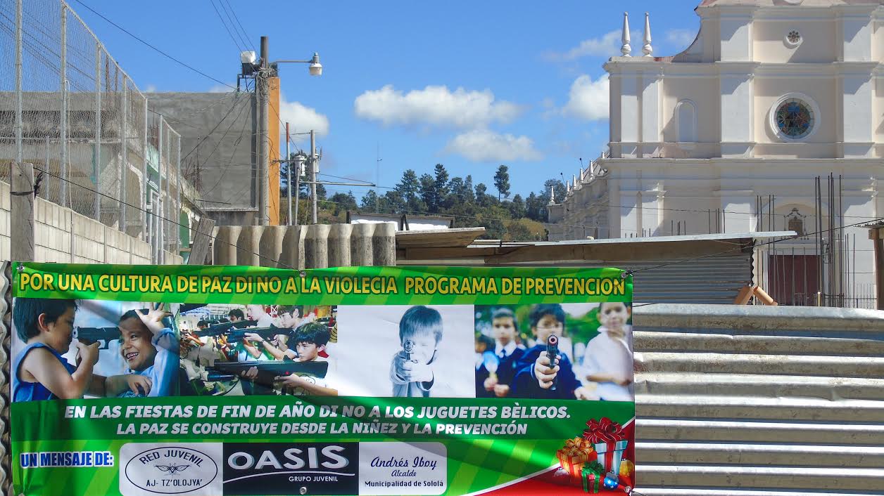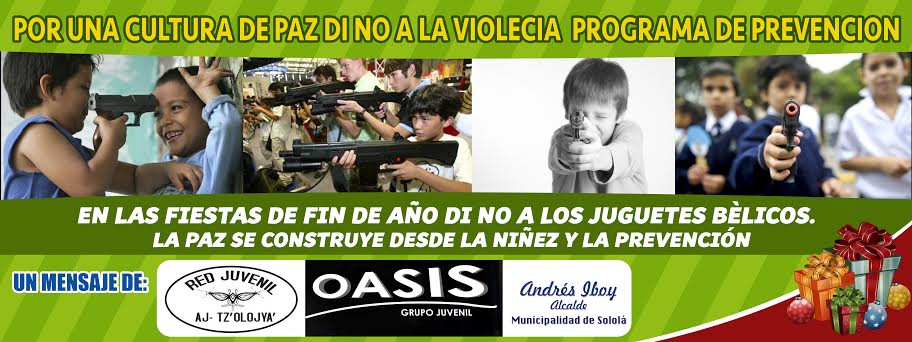 En antesala a estas fiestas de fin de año, invitan a un grupo juvenil Católico denominado OASIS, quienes cuentan con un programa radial y televisivo en cable local. Ambos grupos se sientan, analizan y cuestionan el índice de violencia que día a día se acrecienta en nuestra nación y que enlutece, empobrece y aterroriza a muchas familias guatemaltecas y sololatecas; por ello crean el programa DI NO A LOS JUEGOS BÉLICOS LA PAZ SE CONSTRUYE DESDE LA NIÑEZ Y LA PREVENCIÓN. Este consiste en concientizar y sensibilizar a los padres de familia comerciantes, líderes religiosos y comunitarios, a no permitir la comercialización de estos juegos bélicos que al principio se ven inofensivos, pero que a la larga contaminan y corrompen la mente prematura del niño que en el mañana, será protagonista y diseñador del futuro.