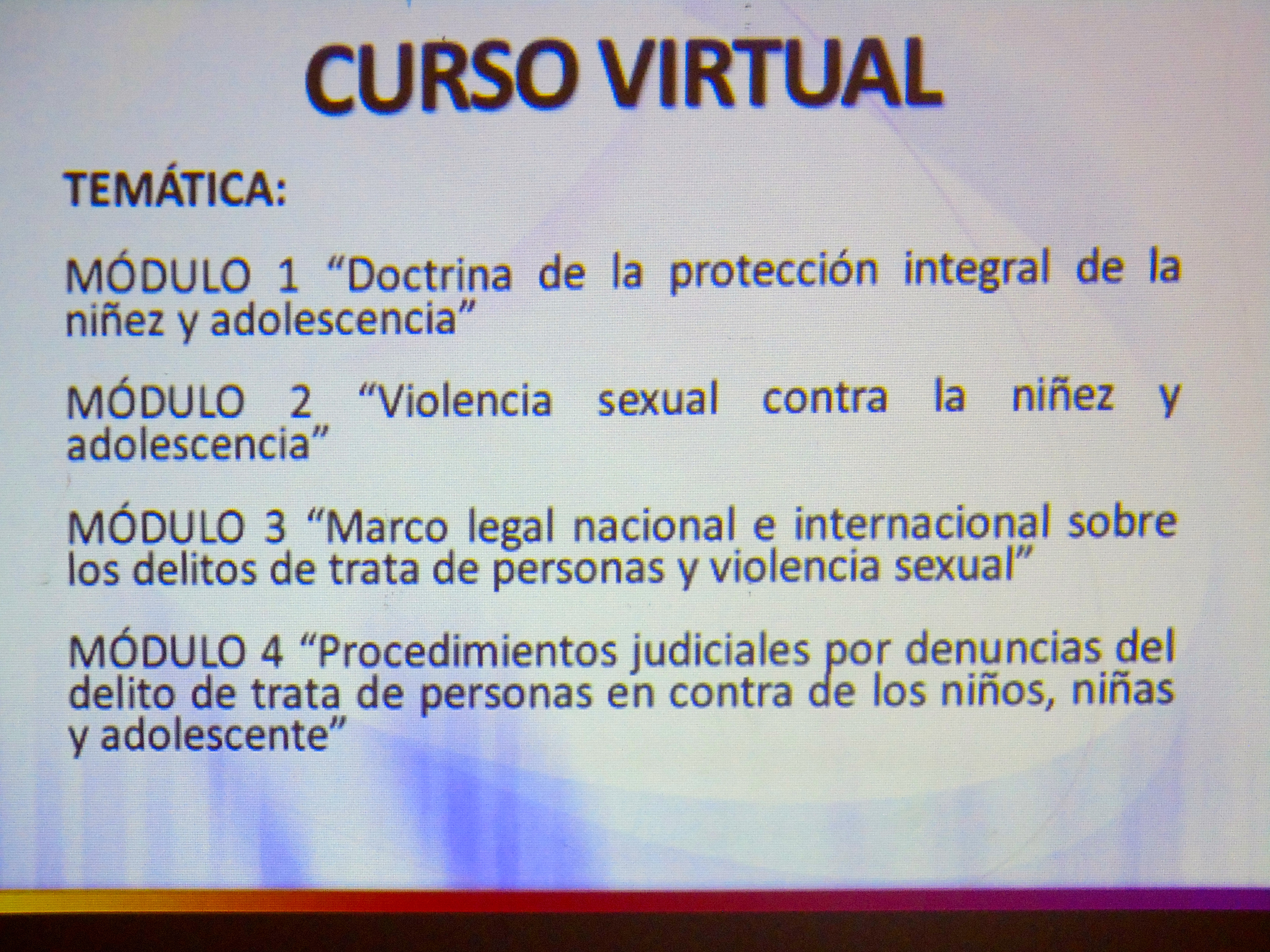 El objetivo de este curso es para formar y capacitar a personas de distintas organizaciones e instituciones que trabajan y velan por el cumplimiento de las leyes estatales, fortaleciendo una cultura de denuncia y así minimizar este fenómeno social que afecta a la población joven de este departamento de Sololá.